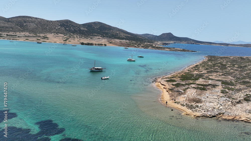 Aerial drone photo of beautiful nature and paradise secluded beaches of small island of Despotiko known for archaeological site untouched by tourism, Antiparos island, Cyclades, Greece