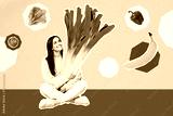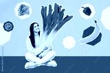 Collage image of cheerful black white effect girl arms hold onion fresh vegetable fruit banana paprika lettuce apple isolated on drawing background
