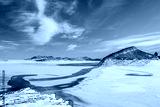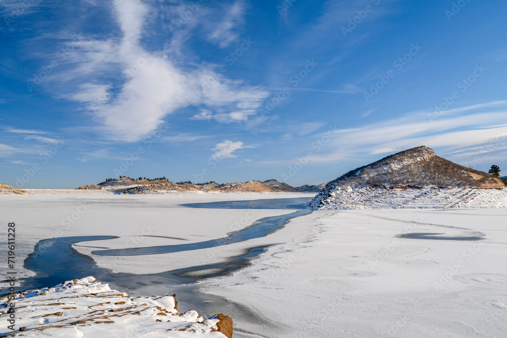 winter scenery of northern Colorado foothills - frozen Horsetooth Reservoir