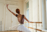 Young ballerina in tutu skirt stretching practicing ballet positions near ballet barre in dance class. Young classical dancer woman in dance studio. Ballet class training. Ballet school concept