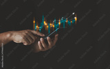 Hand of Businessman or trader is showing a growing virtual hologram stock on smartphone, invest in trading, planning and strategy, Stock market technology, Business growth, progress or success concept