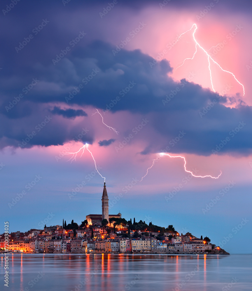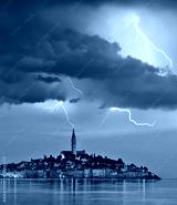 Lightning and storm clouds over the city of Ravinj on the Istrian Peninsula in Croatia. The town is also know by its Italian name of Rovigno.