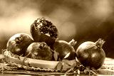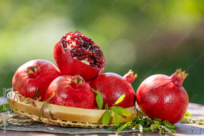 Red Pomegranate in wooden basket on wooden table in garden, Pomegranate with slices on blurred greenery background.