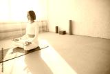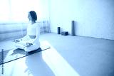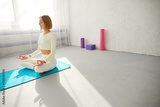 Woman practicing yoga and meditation in lotus pose on yoga mat, relaxed with closed eyes. Mindful meditation concept.