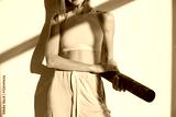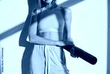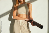 Young sporty woman posing with yoga mat after yoga class. Yoga coach, yoga teacher.