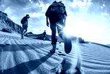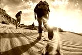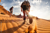 Big group of young hikers or tourists with backpacks walks in sunset Gobi desert