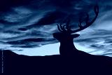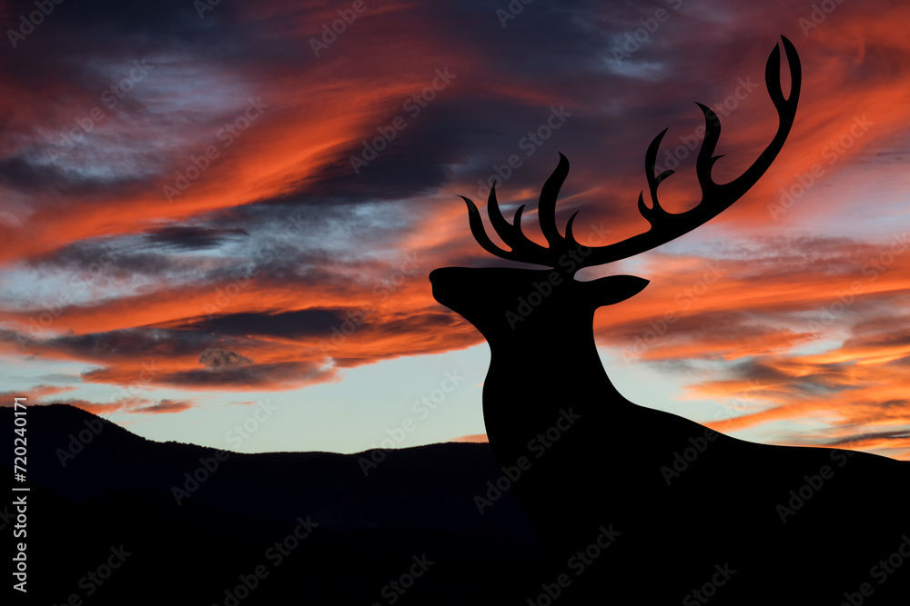 Silhouette of a deer looking at the landscape at sunset. Symbol of wild animals and nature.