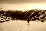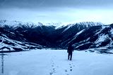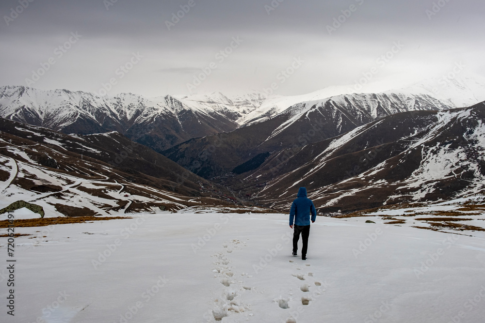 Lone hiker traversing snowy mountain pass. A lone figure in a blue jacket walks across a vast expanse of snow, towards a breathtaking vista of snow-capped mountain ranges. Trabzon, Uzungol, Yedigoller