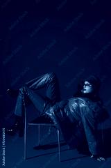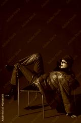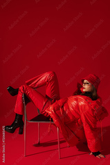 Fashionable confident woman wearing trendy oversized red puffer down jacket, sunglasses, bucket hat, faux leather pants, platform boots, posing on red background. Full-length studio fashion portrait