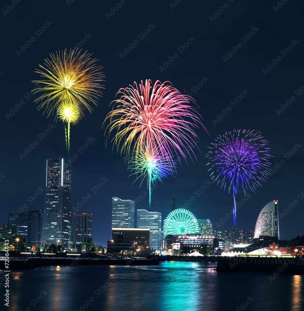 Fireworks celebrating over marina bay in Yokohama, Japan
