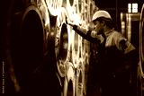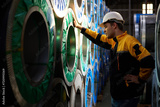 worker or technician checking a roll of industrial aluminum metal material in the factory
