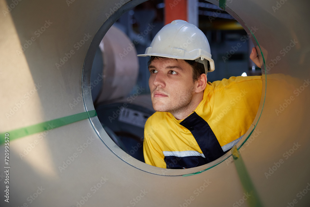 worker or technician checking a roll of industrial aluminum metal material in the factory