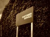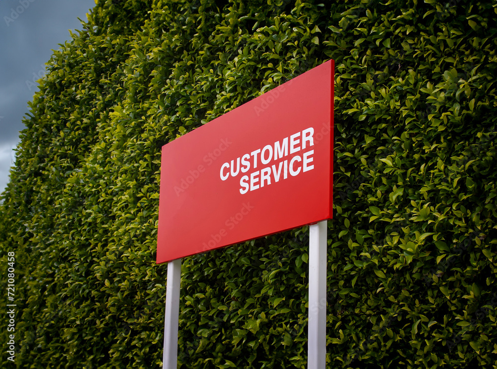 A red rectangular Customer Service Sign with white letters against a green ivy background