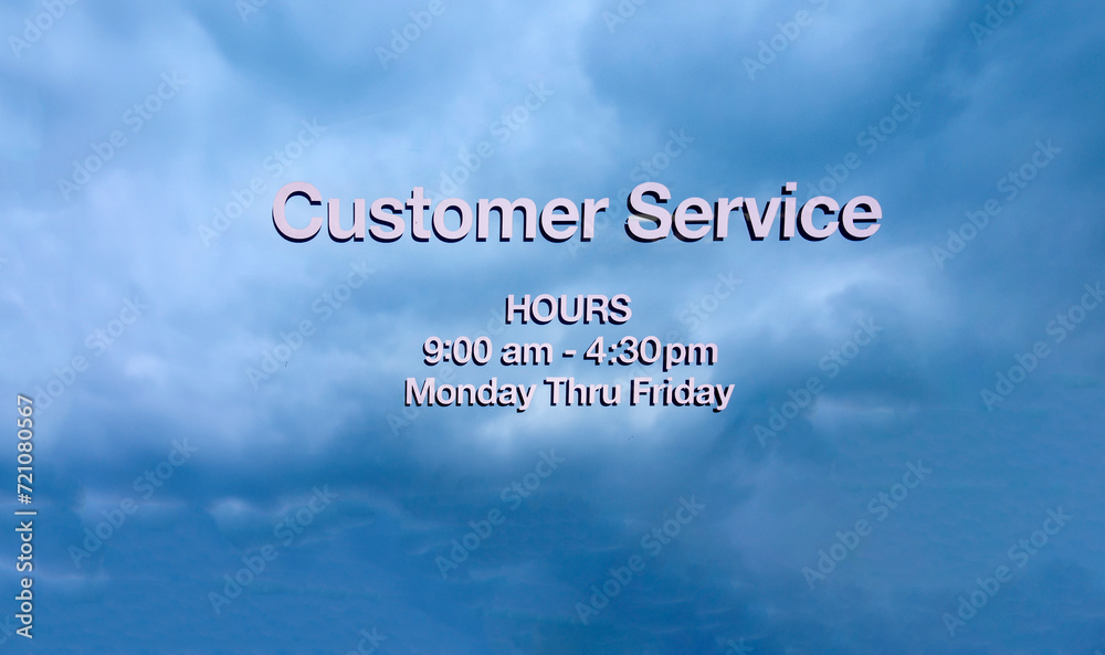 Stenciled letters on glass stating Customer Service against a blue sky