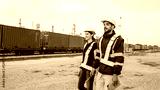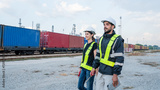 Team of engineer railway wearing safety uniform and helmet under checking train ,wheels and control system for safety transportation. Maintenance cycle concept.