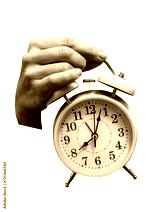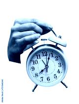 Female hand holding alarm clock through paper background. Inspiration, idea concept, trendy magazine style. art collage. It's time