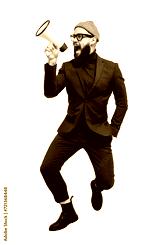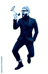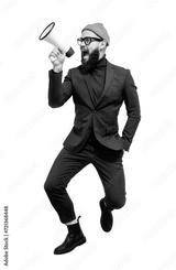Funny portrait of an emotional jumping guy with a megaphone. Collage in magazine style. Discount, sale season. Information concept. Attention news!