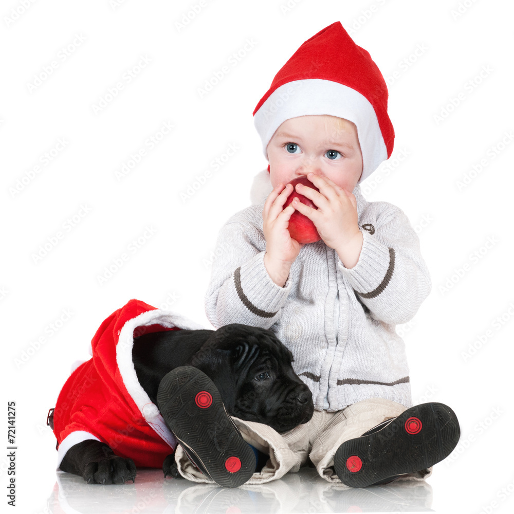 little boy with a puppy in christmas costume