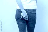 Health care, pain asian young woman suffering from hemorrhoid, anus, diarrhea and constipation, girl hand touching, holds butt, anal have abdominal, intestine problem, abscess disease and smell fart.