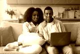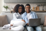 Romantic black spouses relaxing with laptop on comfy sofa at home, couple using computer, browsing internet or shopping online