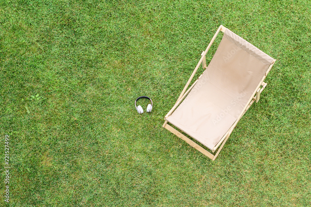 Deck chair with headphones on the green grass sunbathes at summer day. Top view, drone, aerial view.