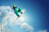 Snowboarder jumping against blue sky
