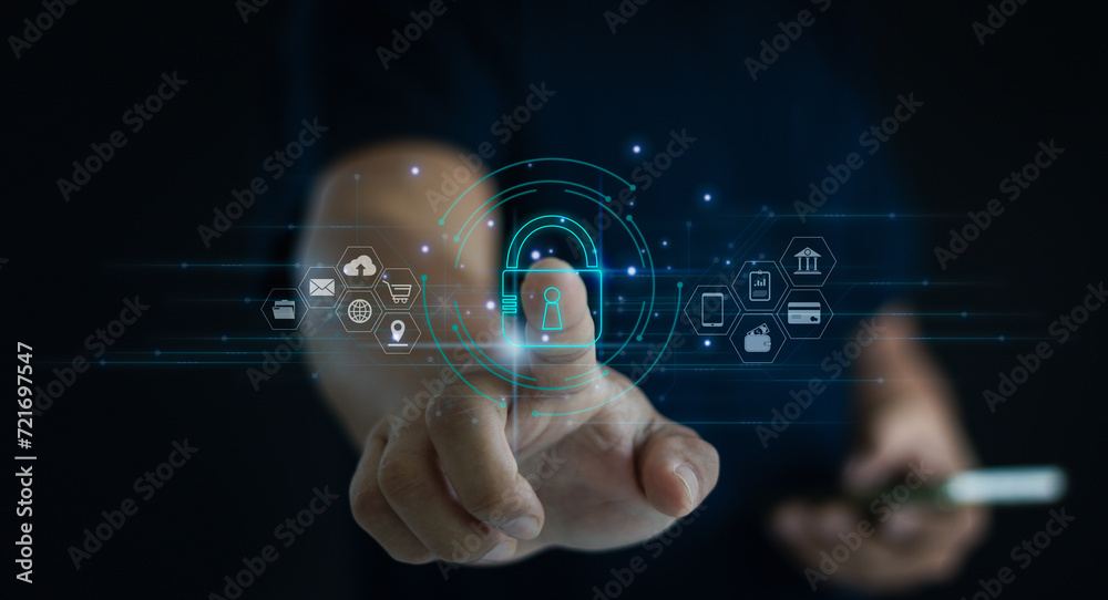 Cybersecurity and privacy concepts to protect data. Businessman use smartphone with cyber security technology for protecting personal data and secure internet access on smartphone with virtual screen.