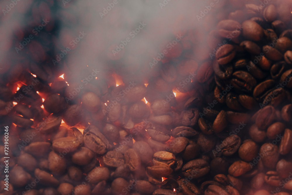 Roasted coffee beans with smoke and fire background. Close up