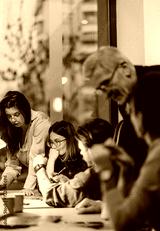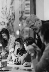 A professional diverse team collaborating during a business meeting in a contemporary well-lit office space. The focus on teamwork and group interaction is evident as they discuss over documents and