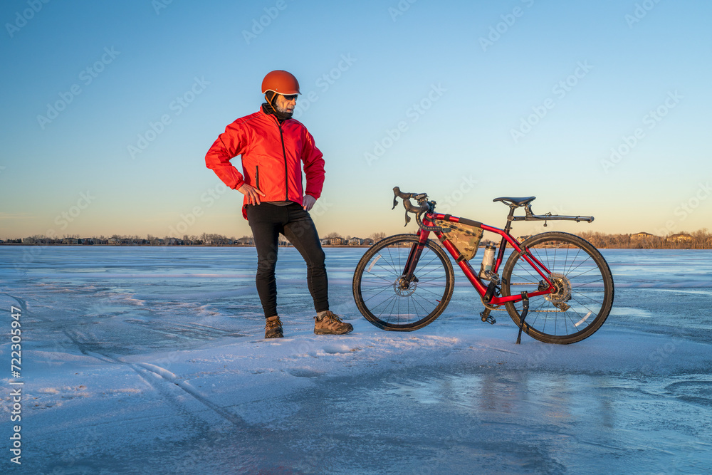 senior male cyclist with his gravel bike on a frozen lake in Colorado - Boyd Lake State Park