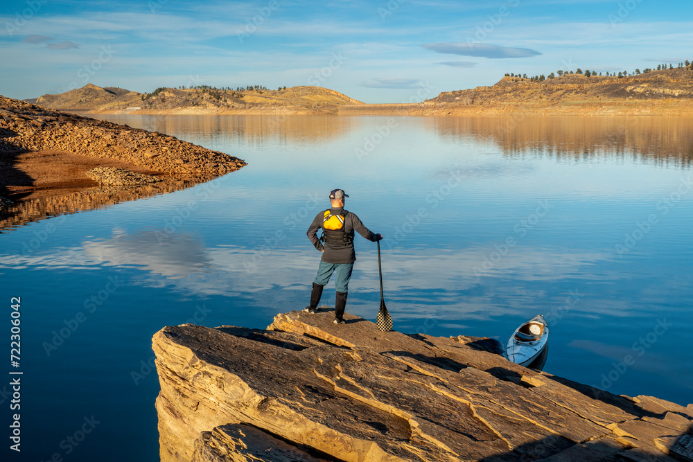 male canoe paddler with a paddle on a rocky shore of a mountain lake - Horsetooth Reservoir in northern Colorado in fall or winter scenery