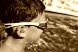 Little boy getting ready to swim in the pool, having ear plugs and goggles. Summer break vacation.
