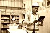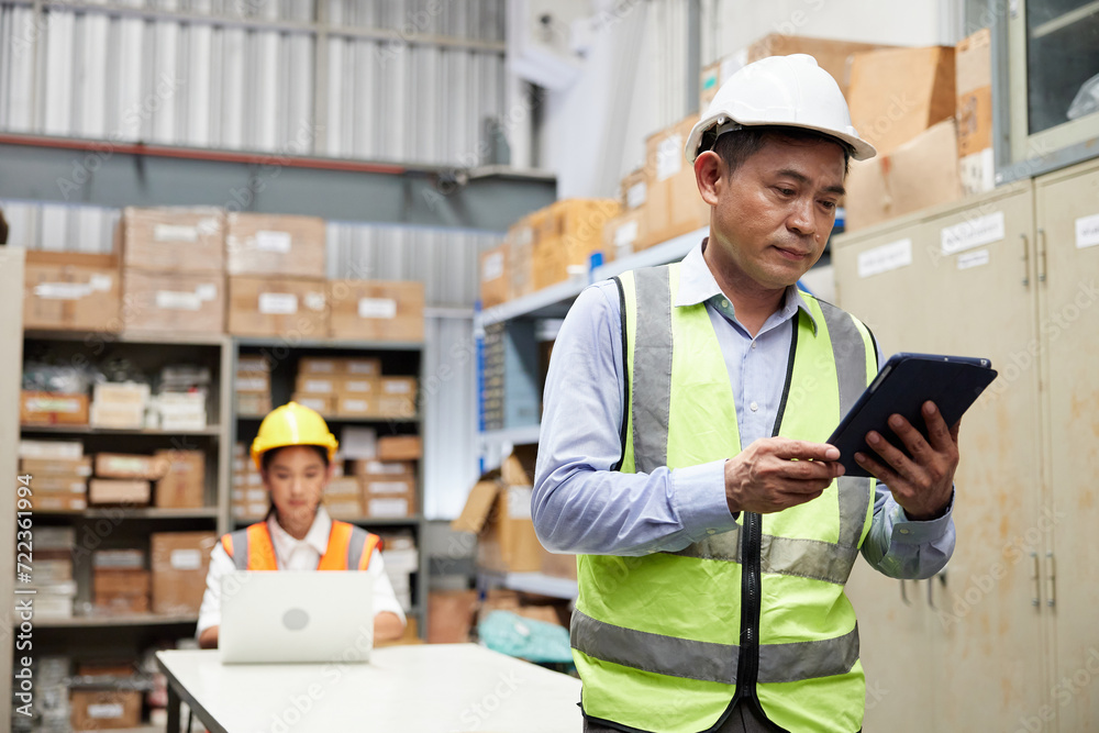 worker working on tablet and looking cardboard box on shelf in warehouse storage