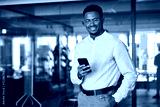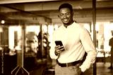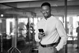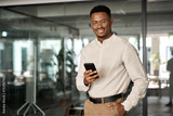 Smiling busy professional African American business man standing in office holding mobile cellphone. Young Black businessman entrepreneur using smartphone looking at camera with cell phone at work.