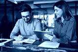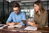 Professional happy middle aged business woman manager explaining work strategy teaching young employee writing notes at workplace. Busy colleagues using digital tablet talking in office.
