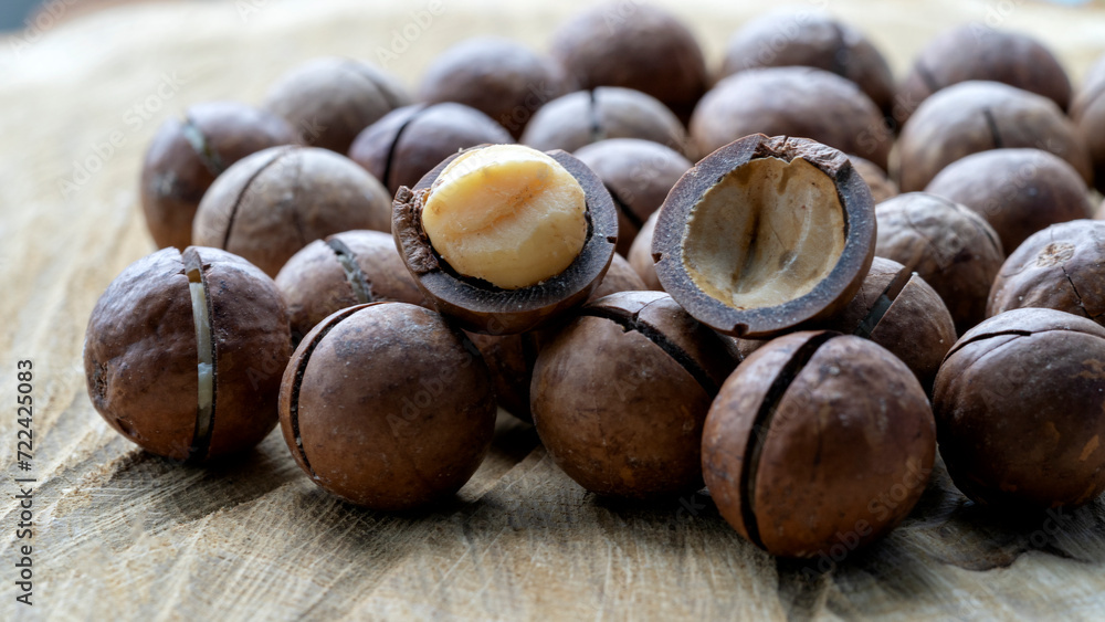 macadamia nuts on a wooden background