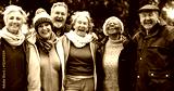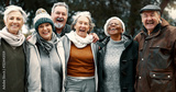 Happy, portrait and senior friends in a park while walking outdoor for fresh air together. Diversity, smile and group of elderly people in retirement taking picture and bonding in a forest in winter.
