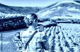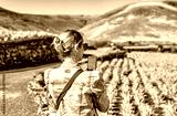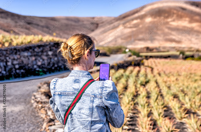 Lanzerote, Spain - December 24, 2023: A woman taking a picture of a field of aloe vera plants on the island of Lanzerote from the Mirador Del Rio viewpoint in Spain's Canary Islands