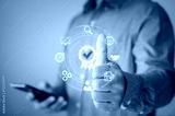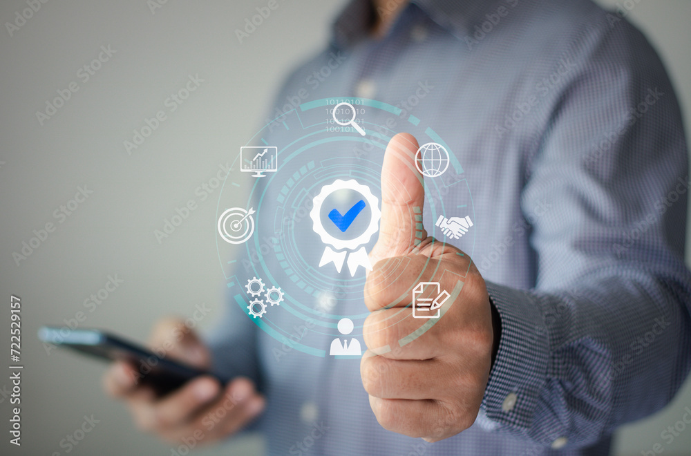 Hand thump up with the sign of the top service Quality assurance, Guarantee, Standards, ISO certification and standardization concept, satisfaction, service experience. Business Marketing Technology.