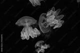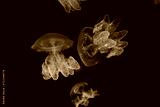 Group of yellow fluorescent jellyfish swimming underwater aquarium pool. The Lychnorhiza lucerna marble jellyfish in dark water, ocean. Theriology, tourism, diving, undersea life.