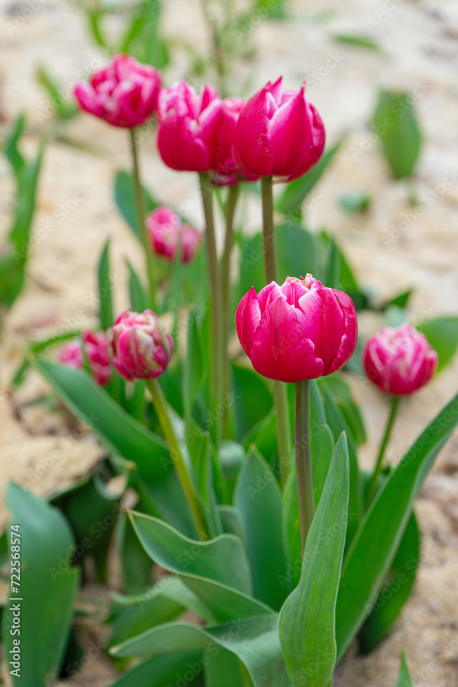 Red tulips flowers with green leaves blooming in a meadow, park, flowerbed outdoor. World Tulip Day. Tulips field, nature, spring, floral background.