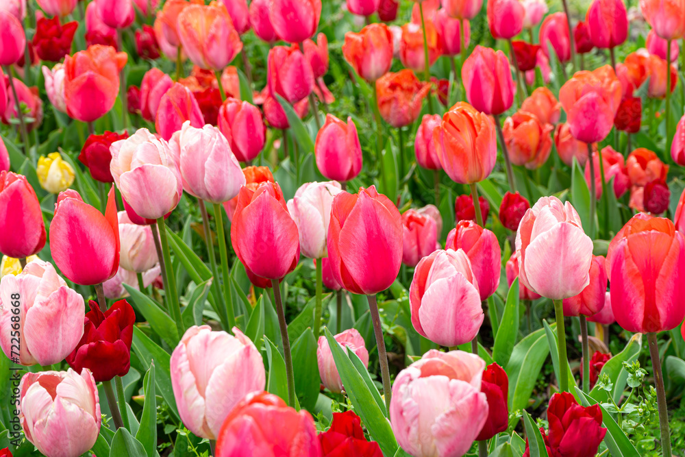 Various tone pink tulips flowers with green leaves blooming in a meadow, park, outdoor. Tulips field, nature, spring, floral background.