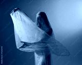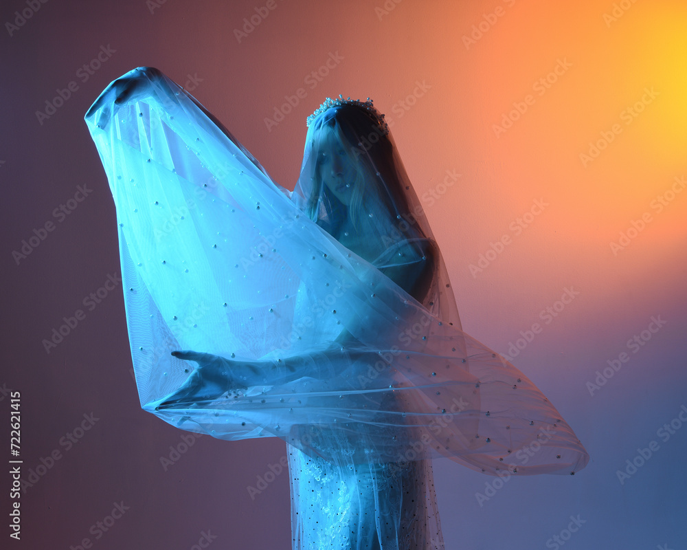 Close up portrait of beautiful model wearing white wedding gown and ghostly flowing veil like a shroud. Moody cinematic lighting, isolated on a dark studio background.