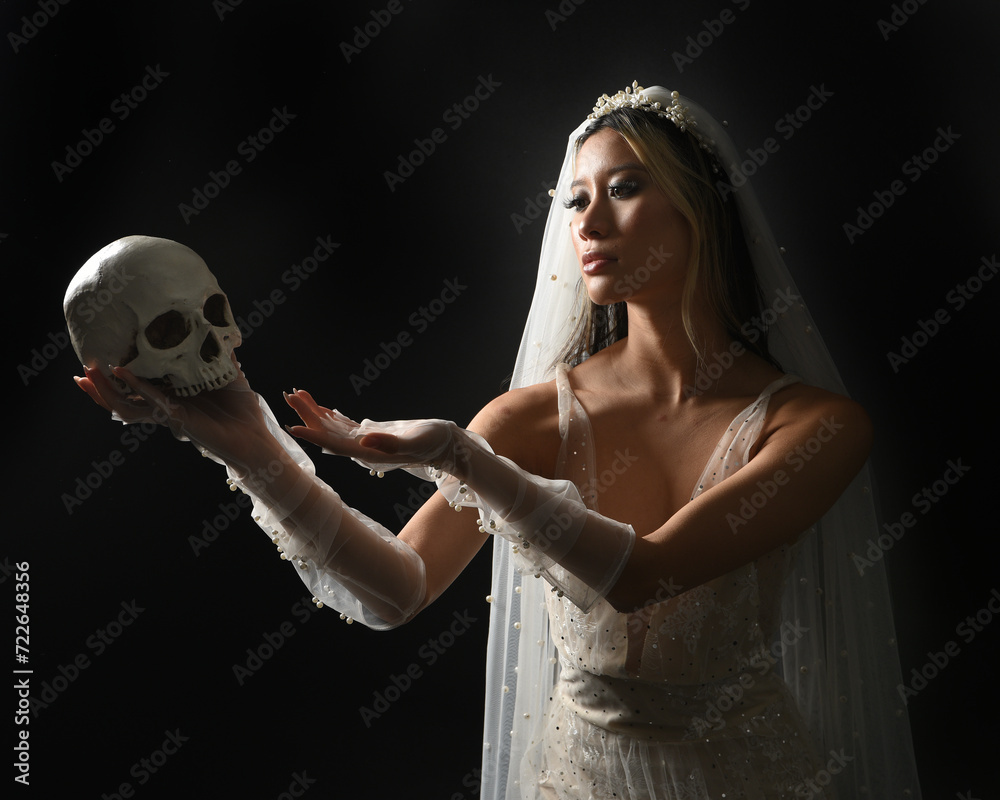 Close up portrait of beautiful model wearing white wedding gown and ghostly flowing veil like a shroud. Holding a skull skeleton. isolated on a dark studio background.