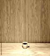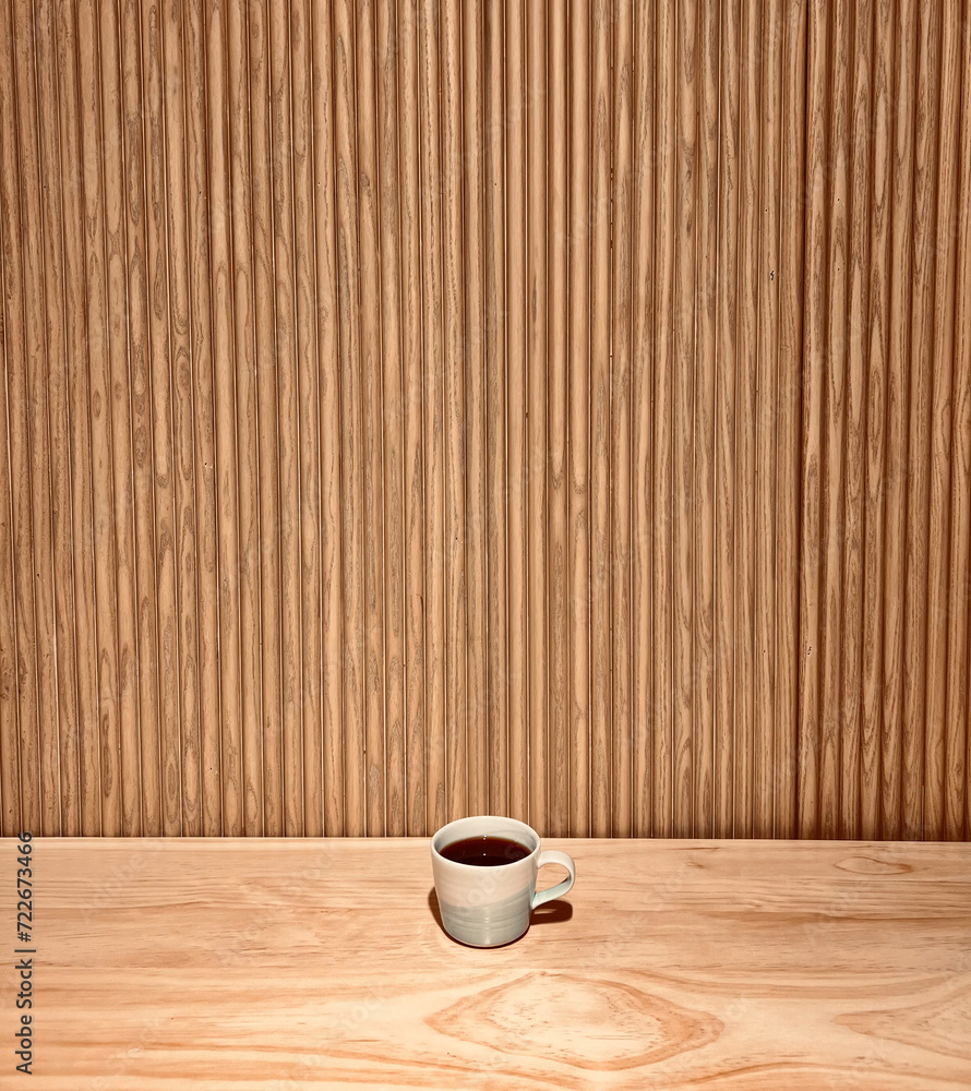 colorful ceramic cup with hot Americano on the table in the minimal and cozy cafe.