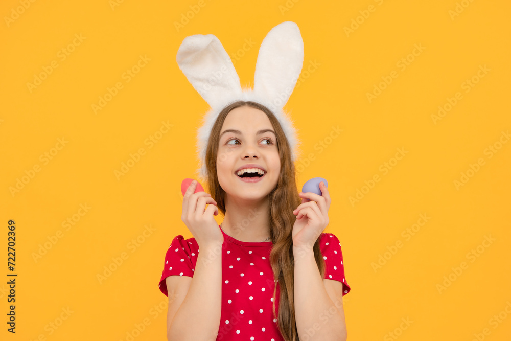 Teenager child wearing bunny ears and hold colorful painted easter eggs isolated at yellow background.