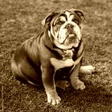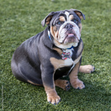 Seven-month-old tri-color English Bulldog Female. Off-leash dog park in Northern California.