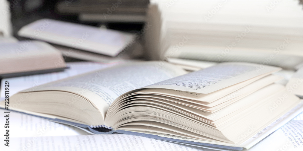 stack of books, close up. Open book on the table in library. Back to school concept. Open book on table with blur bookshelf background
