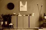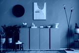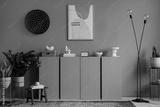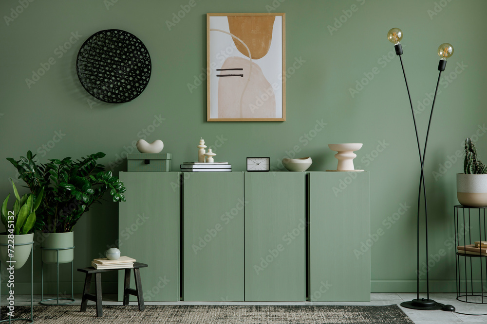 Modern living room interior composition with mockup poster frame, eucalyptus wooden commode, plants and modern home accessories. Eucalyptus wall. Home staging. Template. Copy space.