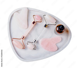 Rose Quartz Roller and Gua Sha Tool, Facial Lifting Scraping Massage Treatment on White Background